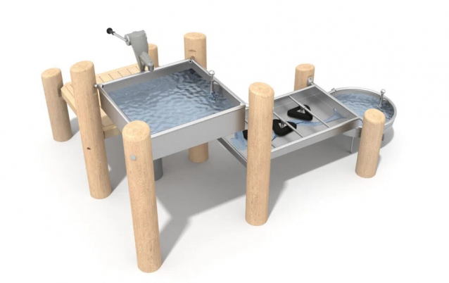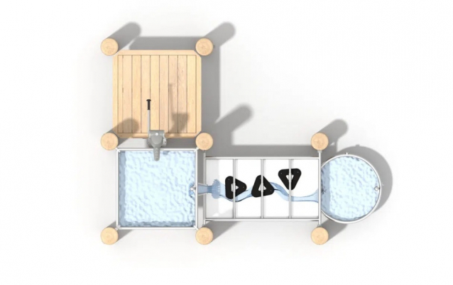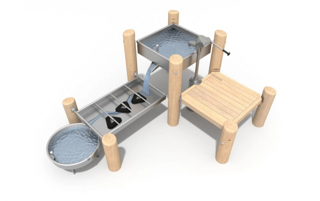 The Water Track Robinia set is an extensive set designed for playing with water and sand. Little explorers can experiment with pouring water and pouring sand, and discover the basic science of water flow. Users will be able to deal with manual pumping of water with the help of a pump and with the help of a trapdoor, and with the help of rotating elements, they will be able to control the water flow path. This device is ideal for natural playgrounds and waterfront facilities.