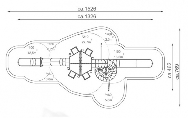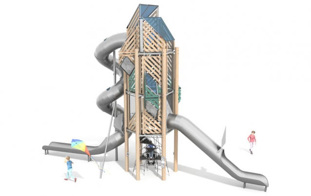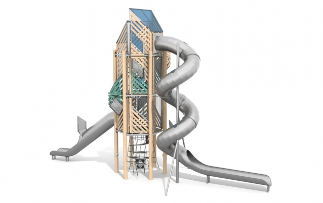 Robinia Wieża 1 to duży, atrakcyjny zestaw zabawowy przeznaczony dla dzieci w wieku od 3 do 12 lat. Jego konstrukcja opiera się na solidnej, sześciokątnej wieży wyposażonej w wielopoziomowe podesty, które umożliwiają stopniowe wspinanie się oraz odkrywanie nowych punktów widokowych. Zestaw oferuje dzieciom różnorodne formy aktywności, znajduje się w nim m.in. dwie różne zjeżdżalnie, które zapewniają urozmaiconą zabawę