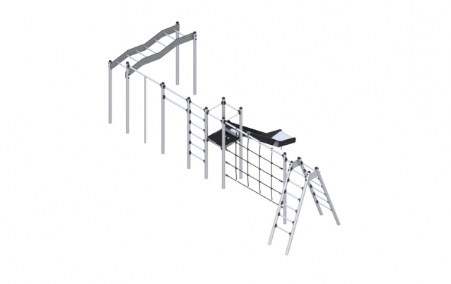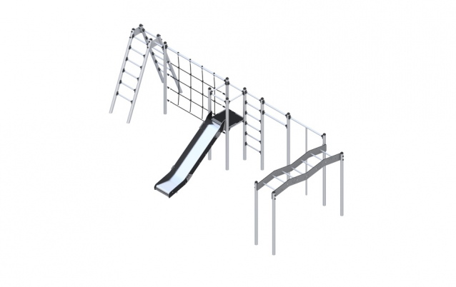 Zestaw Rake City HPL to urządzenie wielofunkcyjne z elementami sprawnościowymi. Składa się z wieży, przeplotni linowej, drabinki poziomej, pionowej i skośnej, rury strażackiej oraz zjeżalni.